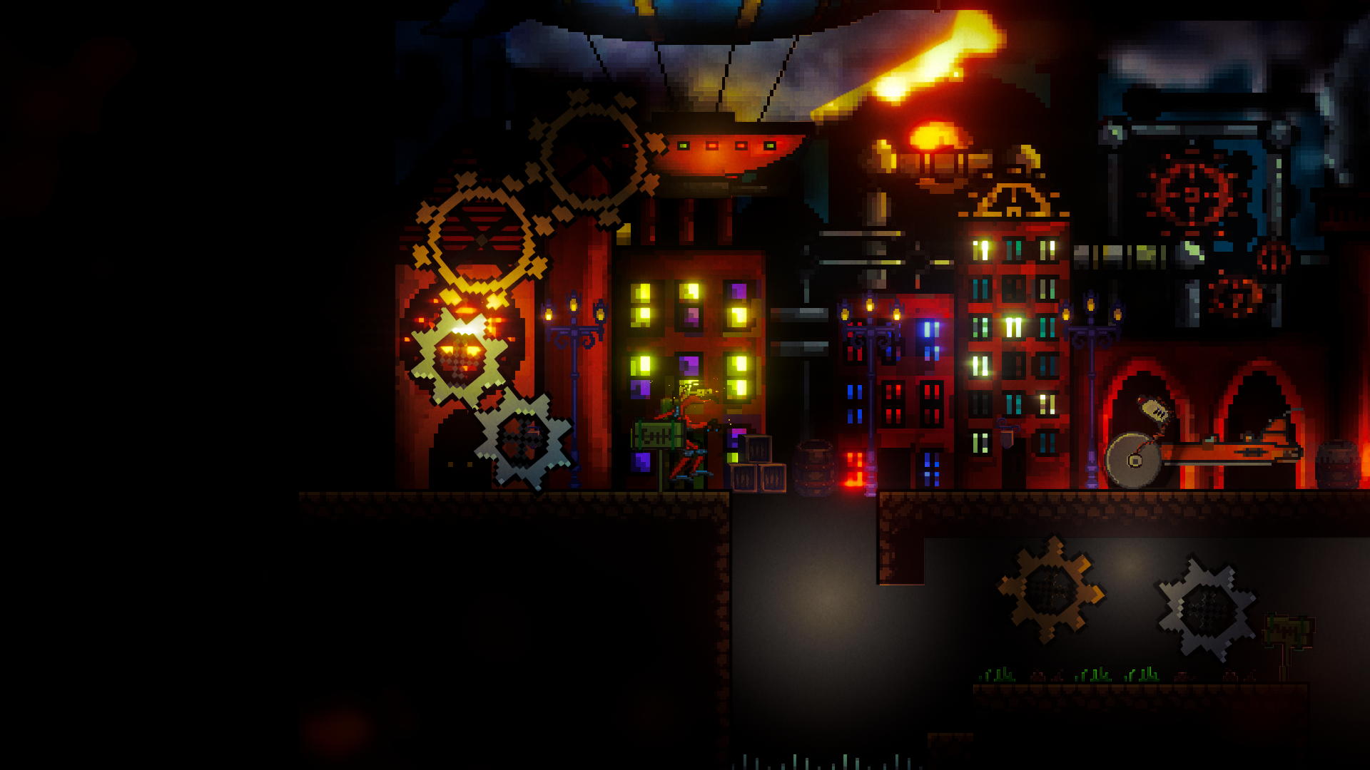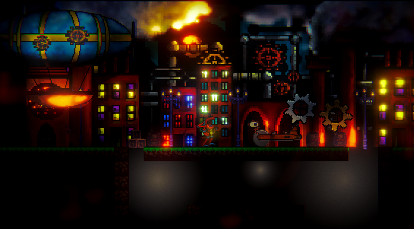 You’re a robot on the run from a lab, sprinting through a steampunk city with a massive zeppelin on your tail. You’re wearing a prototype mask that’s a total death trap—it makes you weak and vulnerable to all the spikes and hazards in the street.